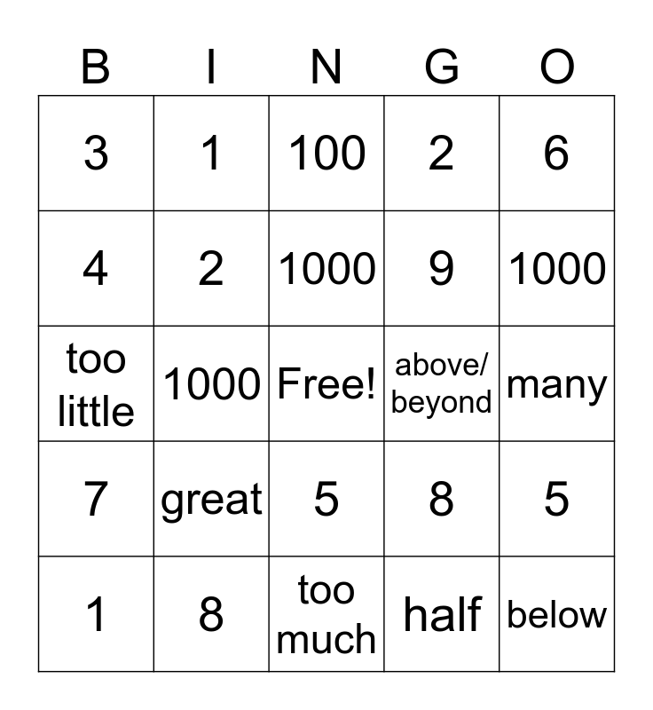 This bingo card has a free space and 29 words: 1, very small, 1000, 10, 3, 100, 2, great, above/ beyond, 8, many, below, too much, half, 1000, measure, 5, 7, 6, too little, 8, more or multiple, 9, 4, 2, 1, 5, 1000 and 7.