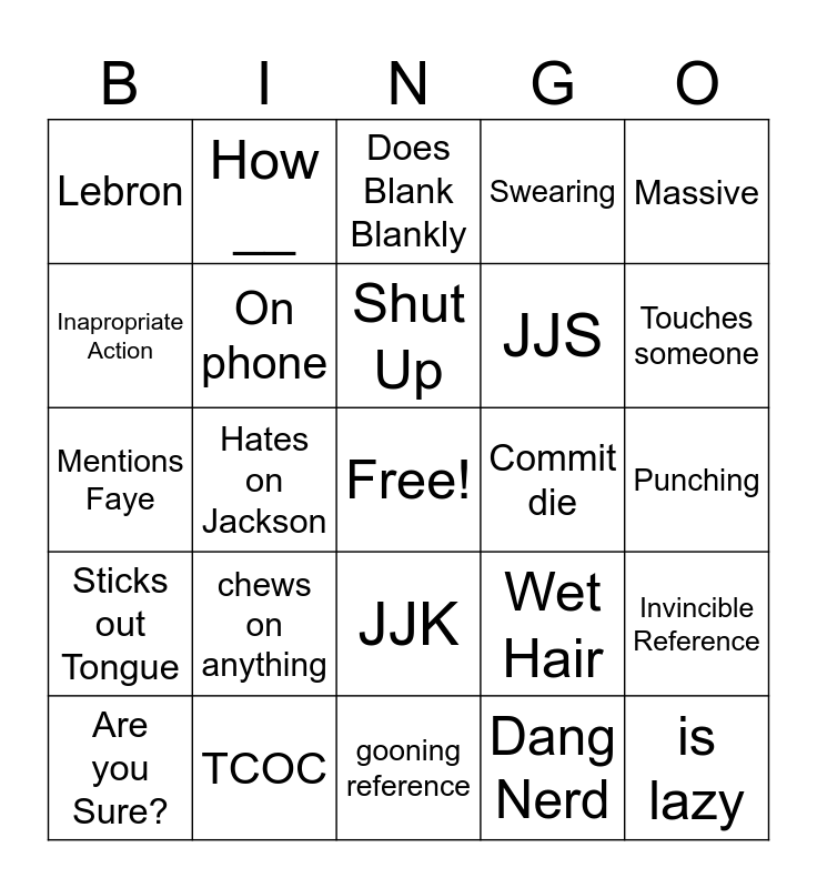 This bingo card has a free space and 24 words: chews on anything, TCOC, Shut Up, Are you Sure?, Massive, Lebron, Inapropriate Action, How __, Commit die, JJK, JJS, Mentions Faye, Wet Hair, Invincible Reference, On phone, Dang Nerd, Punching, Does Blank Blankly, Touches someone, Hates on Jackson, is lazy, Sticks out Tongue, Swearing and gooning reference.
