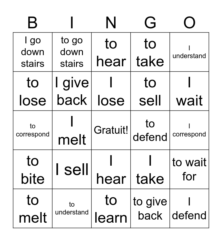This bingo card has a free space and 28 words: to wait for, to answer, to sell, to give back, to lose, to hear, to go down stairs, to bite, to defend, to melt, to correspond, to take, to understand, to learn, I wait, I answer, I sell, I give back, I lose, I hear, I go down stairs, I bite, I defend, I melt, I correspond, I take, I understand and I learn.