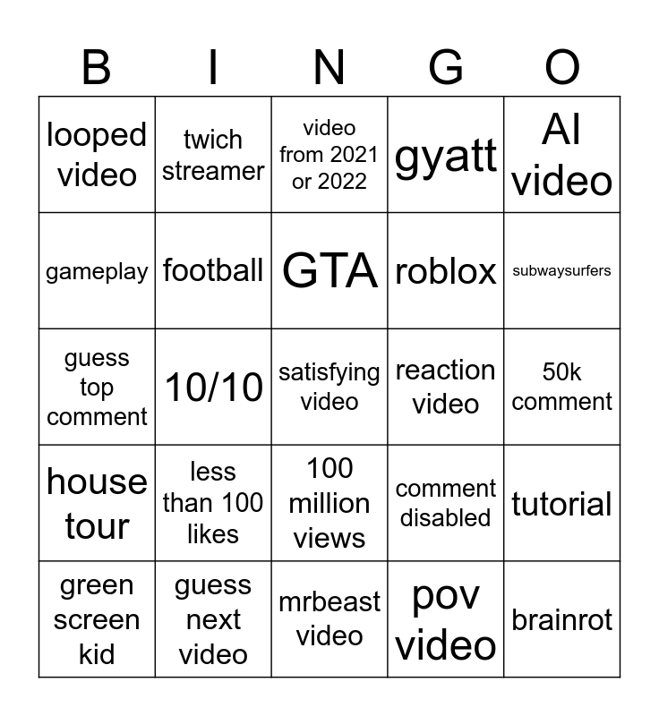 This bingo card has a free space and 24 words: less than 100 likes, guess next video, GTA, green screen kid, AI video, looped video, gameplay, twich streamer, reaction video, 100 million views, roblox, guess top comment, comment disabled, tutorial, football, pov video, 50k comment, video from 2021 or 2022, subwaysurfers, 10/10, brainrot, house tour, gyatt and mrbeast video.
