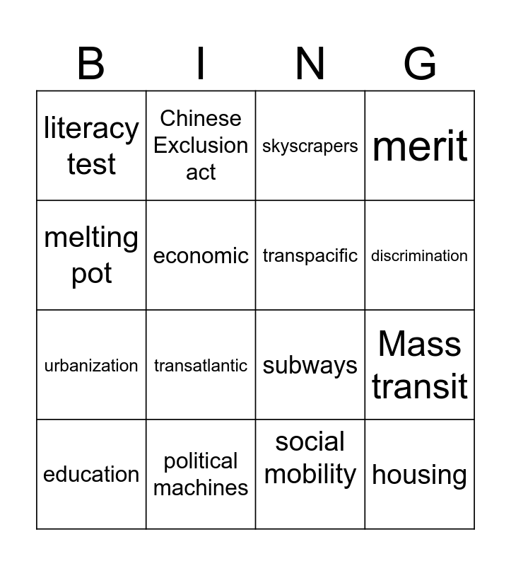 This bingo card has 16 words: political machines, Mass transit, skyscrapers, literacy test, urbanization, Chinese Exclusion act, subways, social mobility, melting pot, economic, education, merit, transatlantic, discrimination, transpacific and housing.