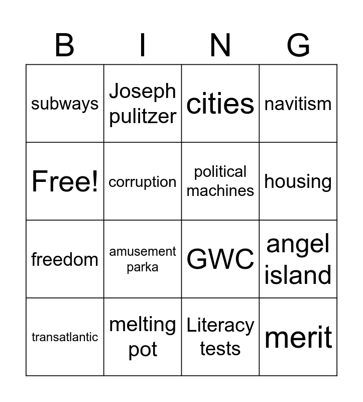 This bingo card has 16 words: melting pot, angel island, cities, subways, freedom, Joseph pulitzer, GWC, Literacy tests, Free!, corruption, transatlantic, navitism, amusement parka, housing, political machines and merit.