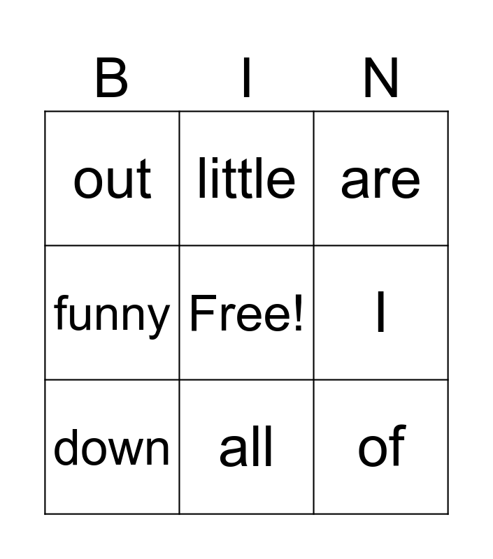 This bingo card has a free space and 8 words: I, are, little, down, out, of, funny and all.