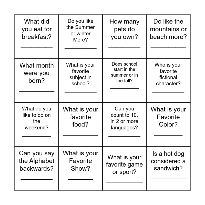 This bingo card has 16 words: What is your Favorite Show? _______, What is your Favorite Color? ________, How many pets do you own? _________, What did you eat for breakfast? _________, What do you like to do on the weekend? __________, Do you like the Summer or winter More? ___________, Can you count to 10, in 2 or more languages? ___________, What is your favorite game or sport? ___________, What month were you born? __________, What is your favorite subject in school? ___________, Can you say the Alphabet backwards? _________, Do like the mountains or beach more? __________, What is your favorite food? __________, Who is your favorite fictional character? ___________, Does school start in the summer or in the fall? ___________ and Is a hot dog considered a sandwich? ___________.
