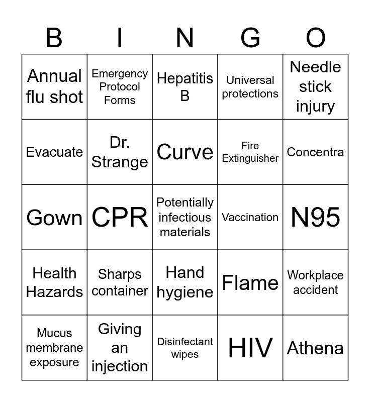 This bingo card has 44 words: Free!, Potentially infectious materials, Parenteral, Mucus membrane exposure, Saliva, HIV, Hepatitis B, Hepatitis C, Needle stick injury, Giving an injection, Universal protections, Vaccination, Hand hygiene, Sharps container, Lock-system needles, Disinfectant wipes, Biohazard trash bins, Gown, Goggles, Concentra, Emergency Protocol Forms, Incident Report, Respiratory transmission, Annual flu shot, Boosters, N95, Safety Data Sheet, Precautionary statements, Flame, Health Hazards, Environmental impact, Workplace accident, Work modifications, Harassment, CPR, Crash cart, EMS, Athena, Curve, Evacuate, Fire Extinguisher, Code Gray, Dr. Strange and Know your rights.