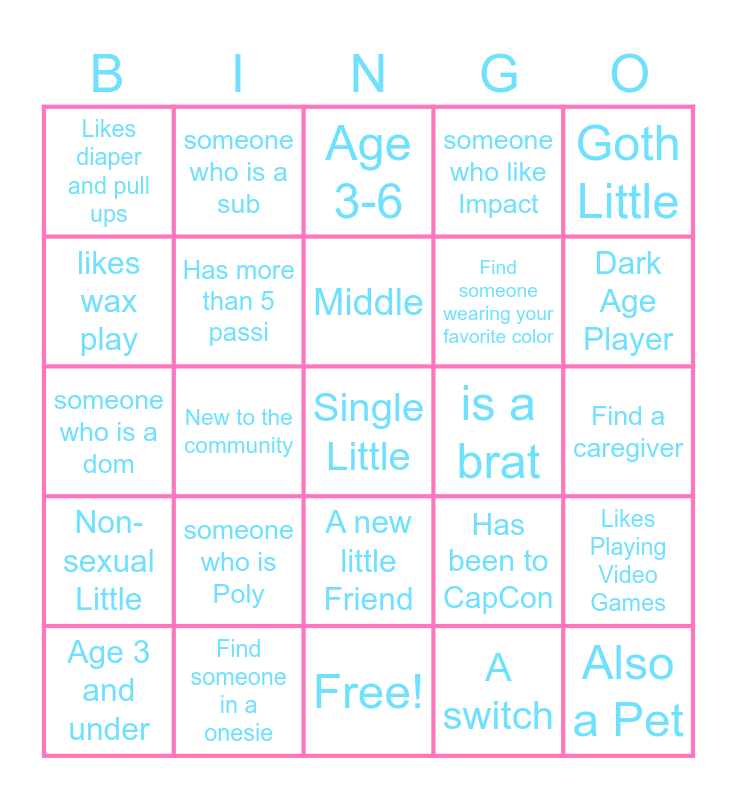 This bingo card has 25 words: Non-sexual Little, Find someone in a onesie, Single Little, A switch, Goth Little, Likes diaper and pull ups, someone who is a sub, Age 3-6, is a brat, Likes Playing Video Games, likes wax play, Has more than 5 passi, Free!, Has been to CapCon, Dark Age Player, Age 3 and under, New to the community, Middle, Find someone wearing your favorite color, Find a caregiver, someone who is a dom, someone who is Poly, A new little Friend, someone who like Impact and Also a Pet.