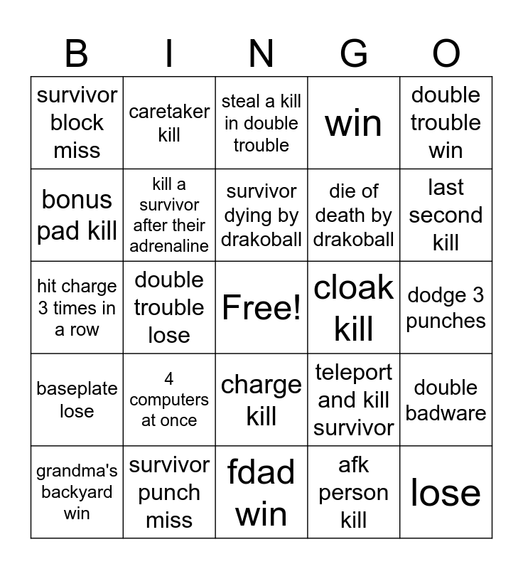 This bingo card has a free space and 24 words: 4 computers at once, survivor punch miss, survivor dying by drakoball, grandma's backyard win, double trouble win, survivor block miss, bonus pad kill, caretaker kill, cloak kill, charge kill, die of death by drakoball, hit charge 3 times in a row, teleport and kill survivor, double badware, kill a survivor after their adrenaline, afk person kill, dodge 3 punches, steal a kill in double trouble, last second kill, double trouble lose, lose, baseplate lose, win and fdad win.