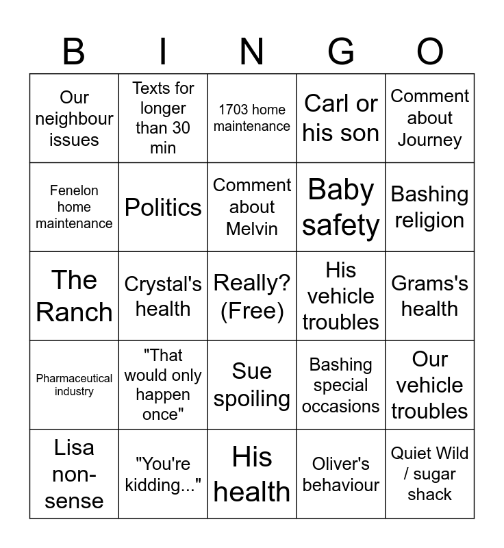 This bingo card has a free space and 24 words: "That would only happen once", "You're kidding...", Comment about Melvin, Lisa non-sense, Comment about Journey, Our neighbour issues, Fenelon home maintenance, Texts for longer than 30 min, His vehicle troubles, Sue spoiling, Baby safety, The Ranch, Bashing special occasions, Our vehicle troubles, Politics, Oliver's behaviour, Grams's health, 1703 home maintenance, Bashing religion, Crystal's health, Quiet Wild / sugar shack, Pharmaceutical industry, Carl or his son and His health.