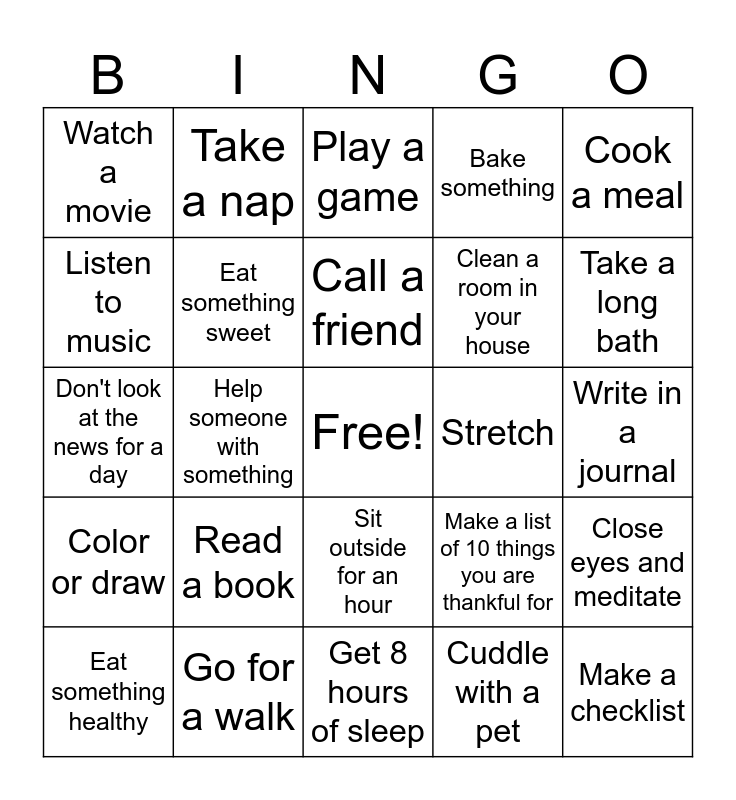 This bingo card has a free space and 24 words: Read a book, Go for a walk, Call a friend, Eat something healthy, Cook a meal, Watch a movie, Listen to music, Take a nap, Stretch, Sit outside for an hour, Clean a room in your house, Don't look at the news for a day, Make a list of 10 things you are thankful for, Close eyes and meditate, Eat something sweet, Cuddle with a pet, Write in a journal, Play a game, Take a long bath, Help someone with something, Make a checklist, Color or draw, Bake something and Get 8 hours of sleep.