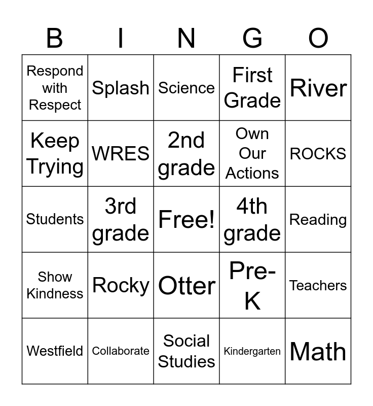 This bingo card has a free space and 24 words: Rocky, Collaborate, 2nd grade, Westfield, River, Respond with Respect, Keep Trying, Splash, 4th grade, Otter, Own Our Actions, Students, Pre-K, Teachers, WRES, Kindergarten, Reading, Science, ROCKS, 3rd grade, Math, Show Kindness, First Grade and Social Studies.