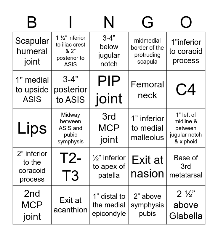 This bingo card has a free space and 24 words: T2-T3, Exit at acanthion, PIP joint, 2nd MCP joint, 1"inferior to coraoid process, Scapular humeral joint, 1" medial to upside ASIS, 1 ½” inferior to iliac crest & 2” posterior to ASIS, 1” inferior to medial malleolus, ½” inferior to apex of patella, Femoral neck, Lips, Exit at nasion, Base of 3rd metatarsal, 3-4” posterior to ASIS, 2” above symphysis pubis, 1” left of midline & between jugular notch & xiphoid, 3-4” below jugular notch, C4, Midway between ASIS and pubic symphysis, 2 ½” above Glabella, 2” inferior to the coracoid process, midmedial border of the protruding scapula and 1” distal to the medial epicondyle.
