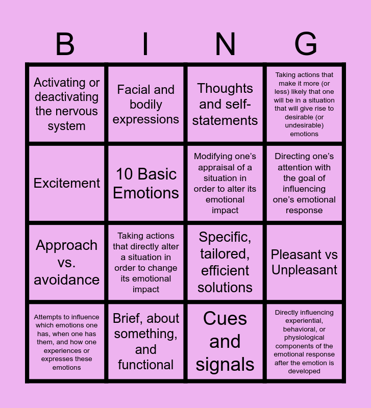 This bingo card has 16 words: Brief, about something, and functional, Pleasant vs Unpleasant, Thoughts and self-statements, Activating or deactivating the nervous system, Approach vs. avoidance, Facial and bodily expressions, Specific, tailored, efficient solutions, Cues and signals, Excitement, 10 Basic Emotions, Attempts to influence which emotions one has, when one has them, and how one experiences or expresses these emotions, Taking actions that make it more (or less) likely that one will be in a situation that will give rise to desirable (or undesirable) emotions, Taking actions that directly alter a situation in order to change its emotional impact, Directing one’s attention with the goal of influencing one’s emotional response, Modifying one’s appraisal of a situation in order to alter its emotional impact and Directly influencing experiential, behavioral, or physiological components of the emotional response after the emotion is developed.