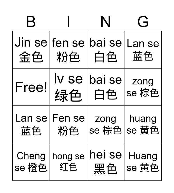 This bingo card has 16 words: hong se 红色, huang se 黄色, bai se 白色, Jin se 金色, Lan se 蓝色, fen se 粉色, zong se 棕色, hei se 黑色, Free!, lv se 绿色, Cheng se 橙色, Lan se 蓝色, Fen se 粉色, zong se 棕色, bai se 白色 and Huang se 黄色.