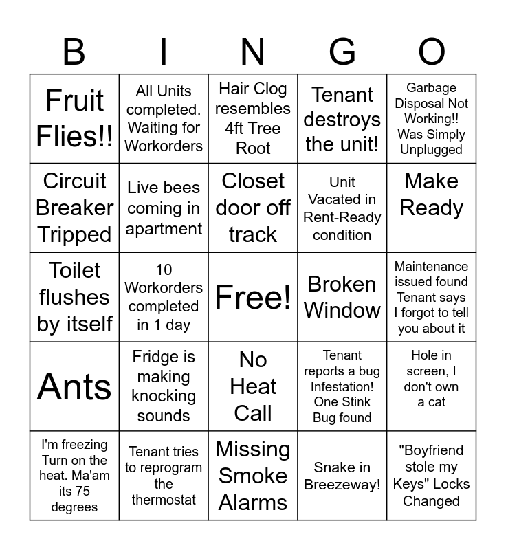 This bingo card has a free space and 49 words: Water Leak - Ceiling Damages, I didn't clog the toilet, I don't know what happened., One workorder reported - 5 others found when in unit, Snake in Breezeway!, Maintenance issued found Tenant says I forgot to tell you about it, Random Item found in the Garbage Disposal, All Units completed. Waiting for Workorders, Weird item found in the HD order, Unit Vacated in Rent-Ready condition, AC Broken, Circuit Breaker Tripped, 10 Workorders completed in 1 day, Tenant reports a bug Infestation! One Stink Bug found, "Boyfriend stole my Keys" Locks Changed, Shop Organized, Ancient Relic found in the walls, Hair Clog resembles 4ft Tree Root, Broken Window, Mentioned in Google Review by Name, Fruit Flies!!, Tenant tries to reprogram the thermostat, Missing Smoke Alarms, Tenant destroys the unit!, Garbage Disposal Not Working!! Was Simply Unplugged, Closet shelf fell down, I didn't put that much stuff on it, Fridge is making knocking sounds, Closet door off track, Disposal not working, nothing inside. Bones found in disposal, Hole in screen, I don't own a cat, Ants, Patio door won't lock, No Heat Call, We love our residents, Can you fix my apartment before I move- out. I don't want to be charged, I'm freezing Turn on the heat. Ma'am its 75 degrees, Can you please take my trash out, I'm infested with roaches, 1 stink bug found, Washes clothes in dishwasher, floods entire building, Make Ready, Blinds won't turn, You need to put in a work order, Can I have some touch up paint, Someone is parked in my carport, Shower hose spraying everywhere, Toilet flushes by itself, Live bees coming in apartment, Crackling noise in wall very annoying, Smoke alarm beeping and Can you do me a favor?.