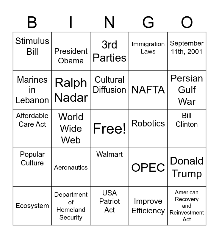 This bingo card has a free space and 29 words: Ecosystem, Afghanistan, World Wide Web, Financial Crisis 2007, Stimulus Bill, 3rd Parties, Ralph Nadar, Aeronautics, Robotics, Department of Homeland Security, Bill Clinton, American Recovery and Reinvestment Act, USA Patriot Act, Improve Efficiency, Persian Gulf War, War on Terrorism, Walmart, Popular Culture, September 11th, 2001, Affordable Care Act, OPEC, Hurricane Katrina, NAFTA, Marines in Lebanon, Immigration Laws, President Obama, Donald Trump, Cultural Diffusion and GATT.