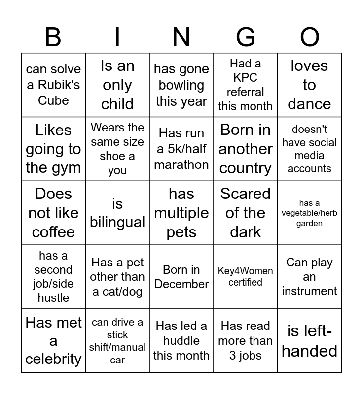 This bingo card has 25 words: Has a pet other than a cat/dog, Has led a huddle this month, Has run a 5k/half marathon, Has met a celebrity, loves to dance, can solve a Rubik's Cube, Likes going to the gym, Is an only child, Scared of the dark, Born in December, Born in another country, Does not like coffee, Key4Women certified, Can play an instrument, Wears the same size shoe a you, is left-handed, has a vegetable/herb garden, has gone bowling this year, doesn't have social media accounts, is bilingual, has multiple pets, can drive a stick shift/manual car, has a second job/side hustle, Had a KPC referral this month and Has read more than 3 jobs.