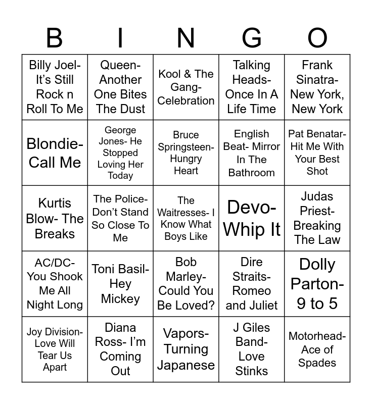 This bingo card has 28 words: Dolly Parton- 9 to 5, Jim Carrol Band- People Who Died, English Beat- Mirror In The Bathroom, J Giles Band- Love Stinks, Blondie- Call Me, Kool & The Gang- Celebration, Queen- Another One Bites The Dust, AC/DC- You Shook Me All Night Long, Devo- Whip It, Joy Division- Love Will Tear Us Apart, Kurtis Blow- The Breaks, Talking Heads- Once In A Life Time, Diana Ross- I’m Coming Out, Vapors- Turning Japanese, Pat Benatar- Hit Me With Your Best Shot, Journey- Any Way You Want It, Toni Basil- Hey Mickey, George Jones- He Stopped Loving Her Today, Bruce Springsteen- Hungry Heart, Bob Marley- Could You Be Loved?, Billy Joel- It’s Still Rock n Roll To Me, Motorhead- Ace of Spades, The Waitresses- I Know What Boys Like, The Police- Don’t Stand So Close To Me, Judas Priest- Breaking The Law, Dire Straits- Romeo and Juliet, Frank Sinatra- New York, New York and Dead Kennedys- Holiday in Cambodia.