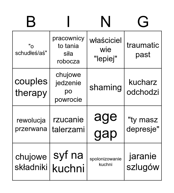 This bingo card has 21 words: syf na kuchni, mama pracuje w kuchni, pracownicy to tania siła robocza, wystrój gorszy niż na początku, spolonizowanie kuchni, shaming, "o schudłeś/aś", właściciel wie "lepiej", age gap, kucharz odchodzi, rewolucja przerwana, traumatic past, jaranie szlugów, restauracja upadła, chujowe jedzenie po powrocie, "to było marzenie męża", chujowe składniki, rzucanie talerzami, couples therapy, "ty masz depresje" and właściciel nie umie zarządzać.