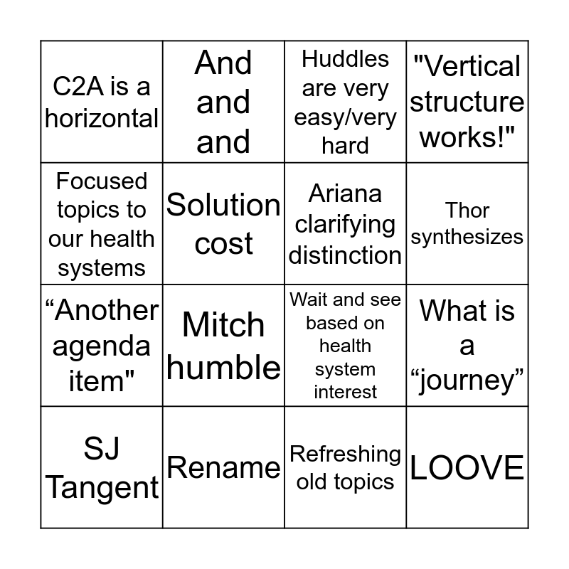 This bingo card has 16 words: Rename, What is a “journey”, Huddles are very easy/very hard, C2A is a horizontal, “Another agenda item", And and and, Wait and see based on health system interest, Refreshing old topics, Focused topics to our health systems, Solution cost, SJ Tangent, "Vertical structure works!", Mitch humble, Thor synthesizes, Ariana clarifying distinction and LOOVE.