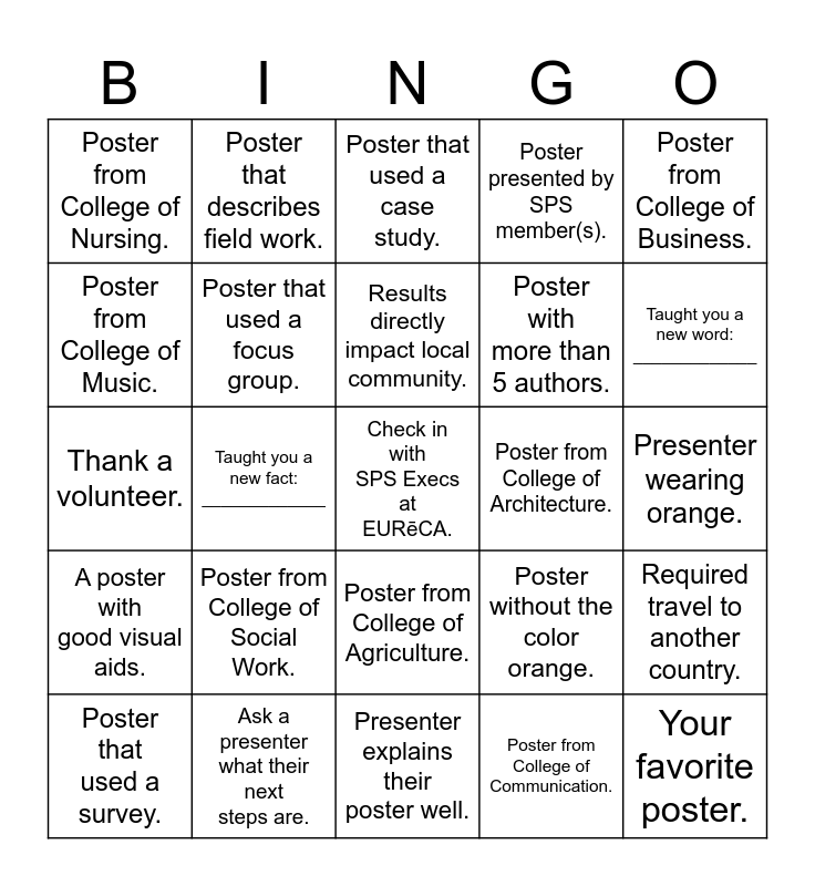 This bingo card has a free space and 24 words: Poster from College of Social Work., Ask a presenter what their next steps are., Results directly impact local community., Poster that used a survey., Poster from College of Business., Poster from College of Nursing., Poster from College of Music., Poster that describes field work., Poster from College of Architecture., Poster from College of Agriculture., Poster with more than 5 authors., Thank a volunteer., Poster without the color orange., Required travel to another country., Poster that used a focus group., Poster from College of Communication., Presenter wearing orange., Poster that used a case study., Taught you a new word: _____________, Taught you a new fact: _____________, Your favorite poster., A poster with good visual aids., Poster presented by SPS member(s). and Presenter explains their poster well..
