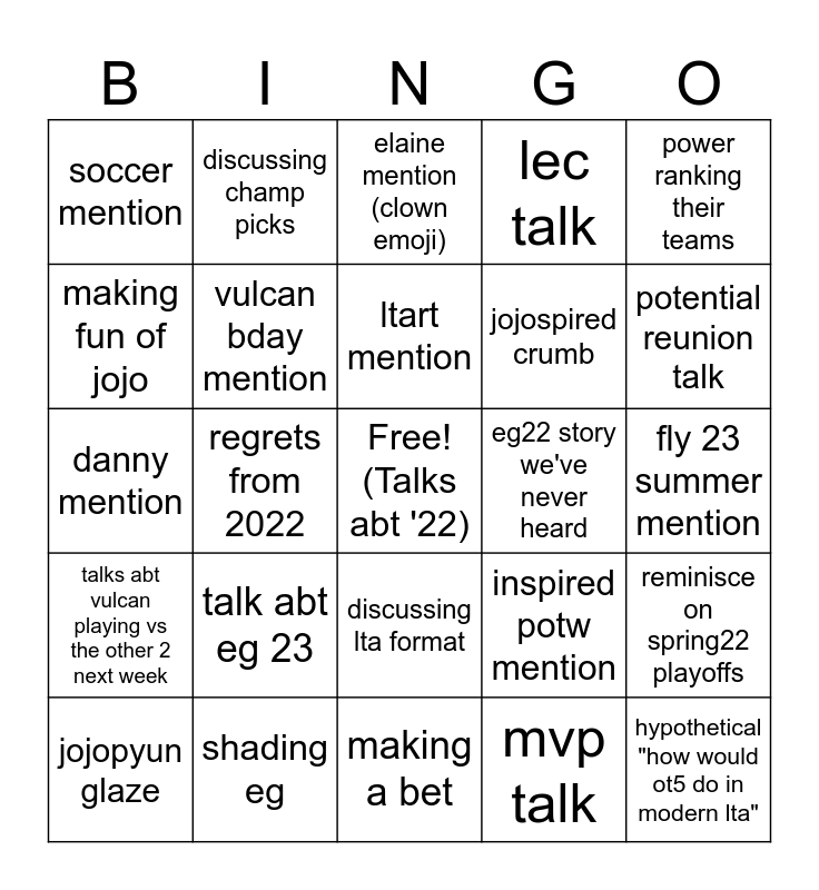 This bingo card has a free space and 24 words: talk abt eg 23, shading eg, ltart mention, jojopyun glaze, power ranking their teams, soccer mention, making fun of jojo, discussing champ picks, eg22 story we've never heard, discussing lta format, jojospired crumb, danny mention, inspired potw mention, reminisce on spring22 playoffs, vulcan bday mention, mvp talk, fly 23 summer mention, elaine mention (clown emoji), potential reunion talk, regrets from 2022, hypothetical "how would ot5 do in modern lta", talks abt vulcan playing vs the other 2 next week, lec talk and making a bet.