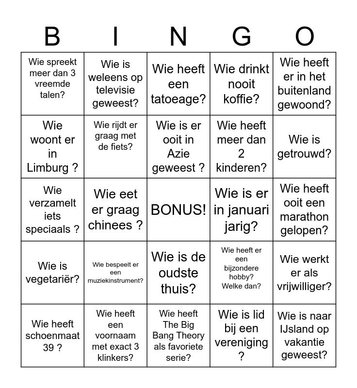 This bingo card has a free space and 24 words: Wie bespeelt er een muziekinstrument?, Wie heeft een voornaam met exact 3 klinkers?, Wie is er ooit in Azie geweest ?, Wie heeft schoenmaat 39 ?, Wie heeft er in het buitenland gewoond?, Wie spreekt meer dan 3 vreemde talen?, Wie woont er in Limburg ?, Wie is weleens op televisie geweest?, Wie is er in januari jarig?, Wie is de oudste thuis?, Wie heeft meer dan 2 kinderen?, Wie verzamelt iets speciaals ?, Wie heeft er een bijzondere hobby? Welke dan?, Wie werkt er als vrijwilliger?, Wie rijdt er graag met de fiets?, Wie is lid bij een vereniging ?, Wie heeft ooit een marathon gelopen?, Wie heeft een tatoeage?, Wie is getrouwd?, Wie eet er graag chinees ?, Wie is naar IJsland op vakantie geweest?, Wie is vegetariër?, Wie drinkt nooit koffie? and Wie heeft The Big Bang Theory als favoriete serie?.