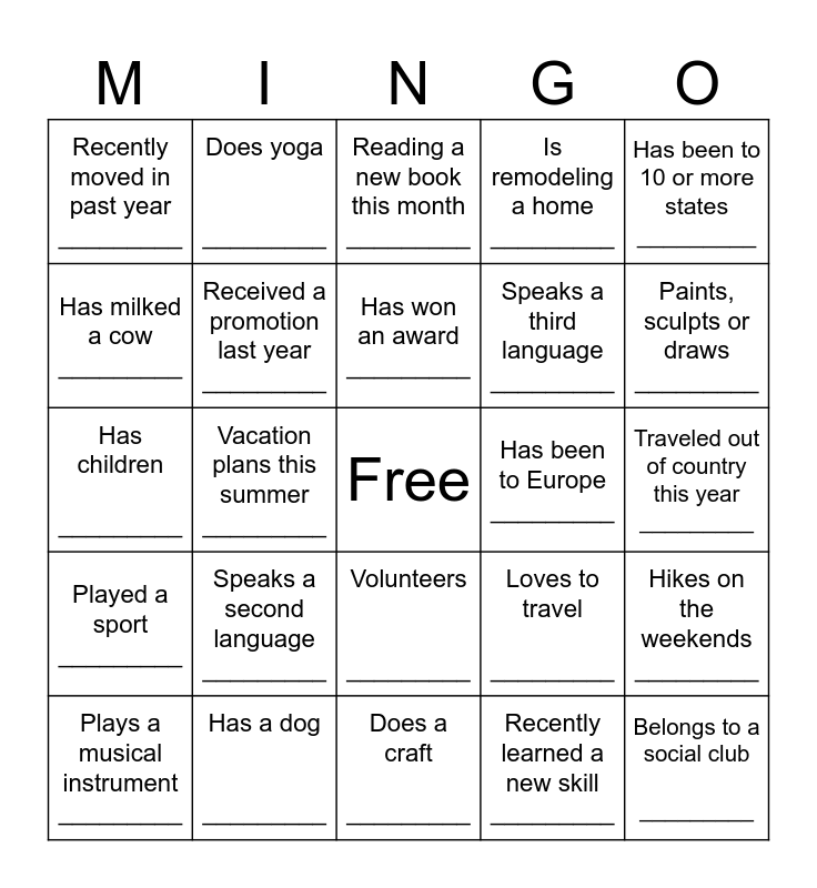 This bingo card has a free space and 24 words: Speaks a second language _________, Has a dog _________, Has won an award _________, Plays a musical instrument _________, Has been to 10 or more states _________, Recently moved in past year _________, Has milked a cow _________, Does yoga _________, Has been to Europe _________, Volunteers _________, Speaks a third language _________, Has children _________, Loves to travel _________, Hikes on the weekends _________, Received a promotion last year _________, Recently learned a new skill _________, Traveled out of country this year _________, Reading a new book this month _________, Paints, sculpts or draws _________, Vacation plans this summer _________, Belongs to a social club _________, Played a sport _________, Is remodeling a home _________ and Does a craft _________.