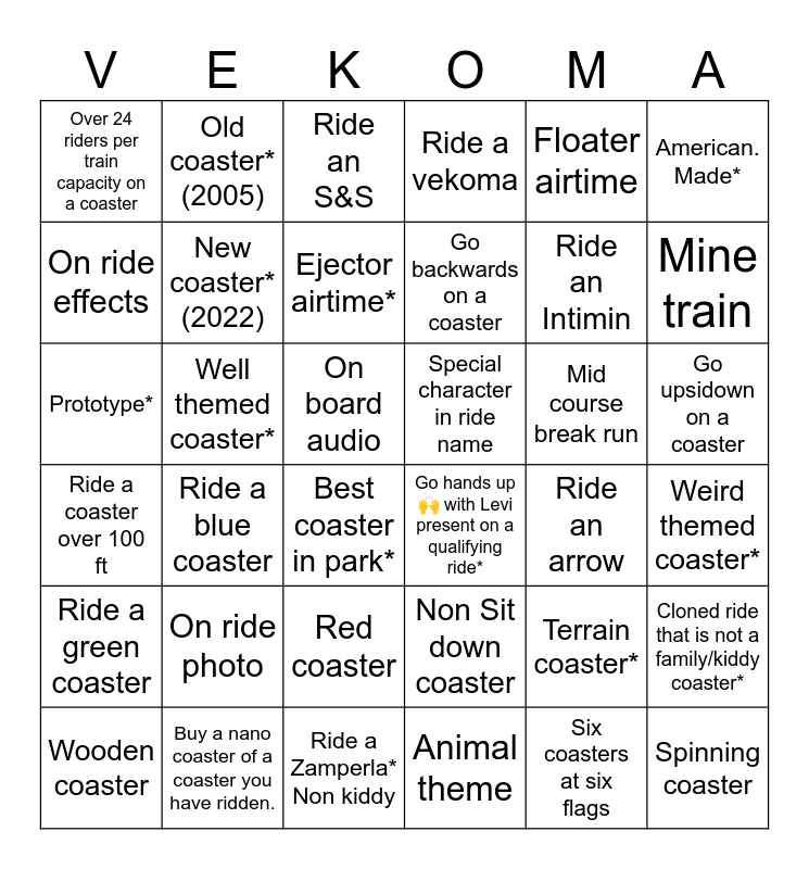 This bingo card has 36 words: Ride a coaster over 100 ft, Ride a blue coaster, Ride a Zamperla* Non kiddy, Go backwards on a coaster, Mid course break run, Go upsidown on a coaster, Over 24 riders per train capacity on a coaster, Buy a nano coaster of a coaster you have ridden., Ride an S&S, Non Sit down coaster, Ride an Intimin, American. Made*, Ride a green coaster, Well themed coaster*, Ejector airtime*, Ride a vekoma, Terrain coaster*, Weird themed coaster*, On ride effects, New coaster* (2022), Best coaster in park*, Go hands up 🙌 with Levi present on a qualifying ride*, Ride an arrow, Cloned ride that is not a family/kiddy coaster*, Prototype*, Old coaster* (2005), On board audio, Animal theme, Floater airtime, Mine train, Wooden coaster, On ride photo, Red coaster, Special character in ride name, Six coasters at six flags and Spinning coaster.
