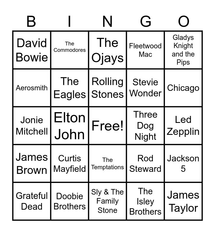 This bingo card has a free space and 24 words: Grateful Dead, Curtis Mayfield, Rolling Stones, The Isley Brothers, Gladys Knight and the Pips, David Bowie, The Commodores, The Ojays, Three Dog Night, Led Zepplin, Jonie Mitchell, The Eagles, Rod Steward, Jackson 5, Aerosmith, Doobie Brothers, Sly & The Family Stone, Fleetwood Mac, Chicago, James Brown, Elton John, The Temptations, Stevie Wonder and James Taylor.
