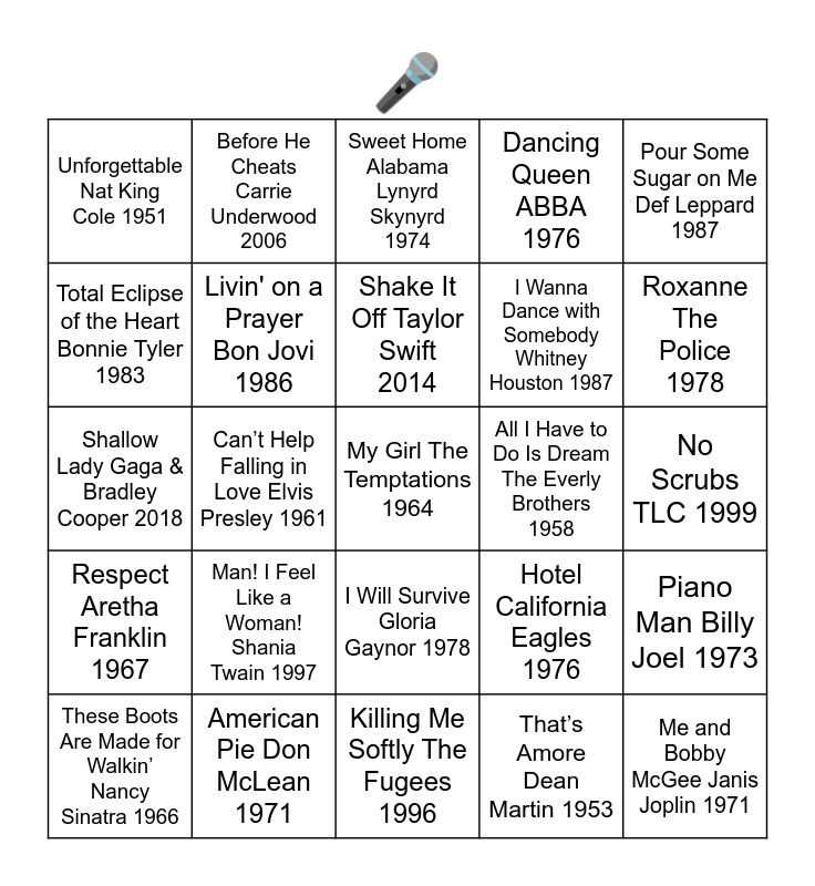 This bingo card has 35 words: Bohemian Rhapsody Queen 1975, Don't Stop Believin' Journey 1981, Sweet Caroline Neil Diamond 1969, Livin' on a Prayer Bon Jovi 1986, I Will Survive Gloria Gaynor 1978, Dancing Queen ABBA 1976, Total Eclipse of the Heart Bonnie Tyler 1983, Summer Nights Grease Soundtrack 1978, Shake It Off Taylor Swift 2014, Someone Like You Adele 2011, Shallow Lady Gaga & Bradley Cooper 2018, Pour Some Sugar on Me Def Leppard 1987, You Shook Me All Night Long AC/DC 1980, Jailhouse Rock Elvis Presley 1957, Unforgettable Nat King Cole 1951, All I Have to Do Is Dream The Everly Brothers 1958, That’s Amore Dean Martin 1953, Can’t Help Falling in Love Elvis Presley 1961, Respect Aretha Franklin 1967, My Girl The Temptations 1964, Hotel California Eagles 1976, These Boots Are Made for Walkin’ Nancy Sinatra 1966, Piano Man Billy Joel 1973, American Pie Don McLean 1971, Sweet Home Alabama Lynyrd Skynyrd 1974, Roxanne The Police 1978, Me and Bobby McGee Janis Joplin 1971, Girls Just Want to Have Fun Cyndi Lauper 1983, I Wanna Dance with Somebody Whitney Houston 1987, No Scrubs TLC 1999, I Want It That Way Backstreet Boys 1999, Killing Me Softly The Fugees 1996, Man! I Feel Like a Woman! Shania Twain 1997, Before He Cheats Carrie Underwood 2006 and "New York, New York" -Frank Sinatra - 1977.