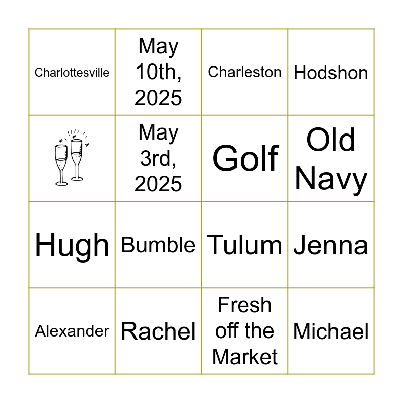 This bingo card has 1 images and 15 words: Rachel, Jenna, Charleston, Charlottesville, Hugh, May 10th, 2025, Tulum, Fresh off the Market, May 3rd, 2025, Alexander, Hodshon, Bumble, Old Navy, Golf and Michael.