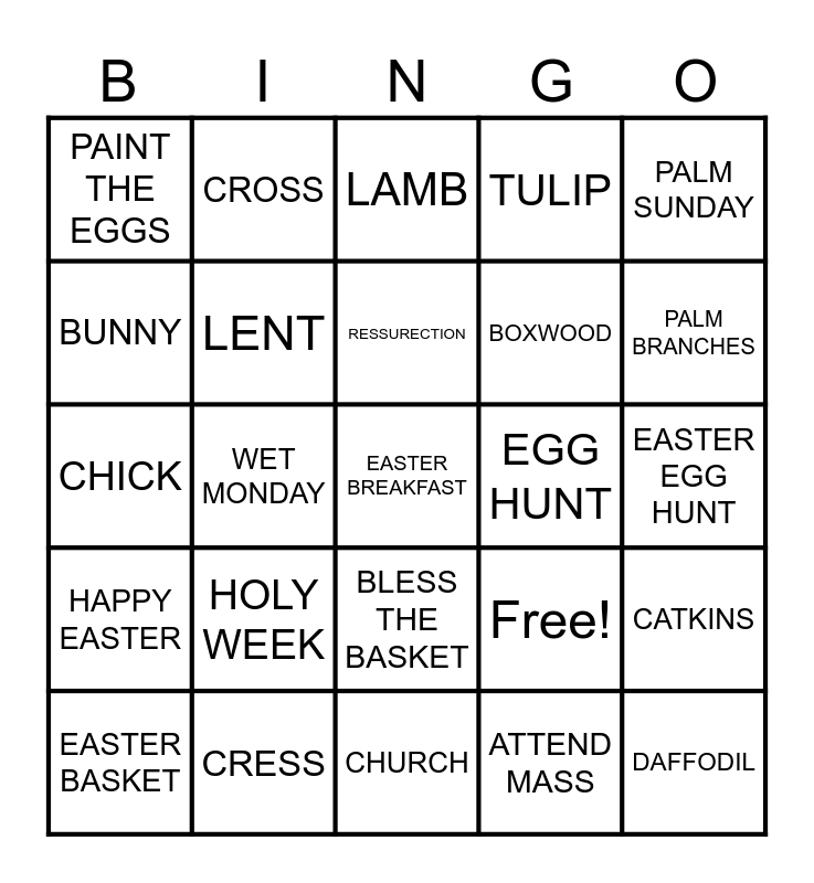 This bingo card has 27 words: Free!, DAFFODIL, BOXWOOD, CHURCH, BUNNY, LAMB, CROSS, HAPPY EASTER, EGG HUNT, CATKINS, CHICK, TULIP, EASTER BASKET, CRESS, PALM BRANCHES, THROWING WATER, LENT, RESSURECTION, HOLY WEEK, PAINT THE EGGS, EASTER EGG HUNT, ATTEND MASS, WET MONDAY, EASTER BREAKFAST, BLESS THE BASKET, PALM SUNDAY and EGG ROLLING.
