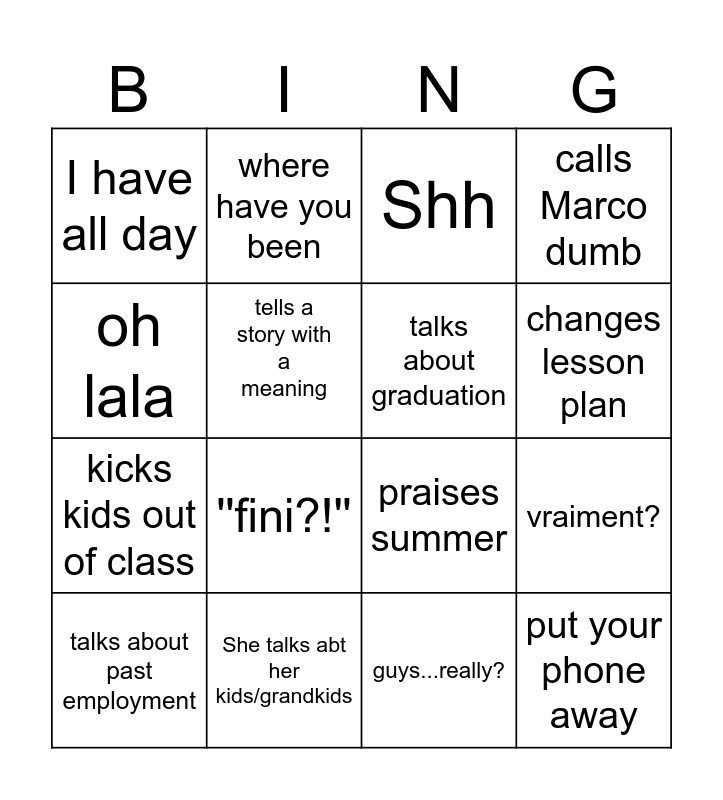 This bingo card has 16 words: She talks abt her kids/grandkids, vraiment?, Shh, I have all day, kicks kids out of class, where have you been, praises summer, guys...really?, oh lala, tells a story with a meaning, talks about past employment, calls Marco dumb, ''fini?!'', changes lesson plan, talks about graduation and put your phone away.