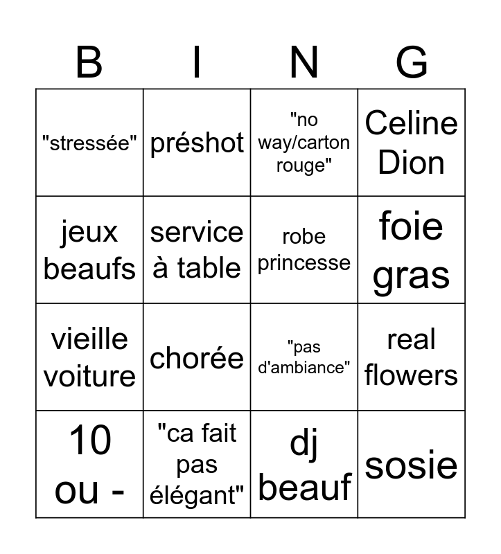 This bingo card has 16 words: "ca fait pas élégant", real flowers, "no way/carton rouge", "stressée", vieille voiture, préshot, "pas d'ambiance", dj beauf, jeux beaufs, service à table, 10 ou -, Celine Dion, chorée, foie gras, robe princesse and sosie.