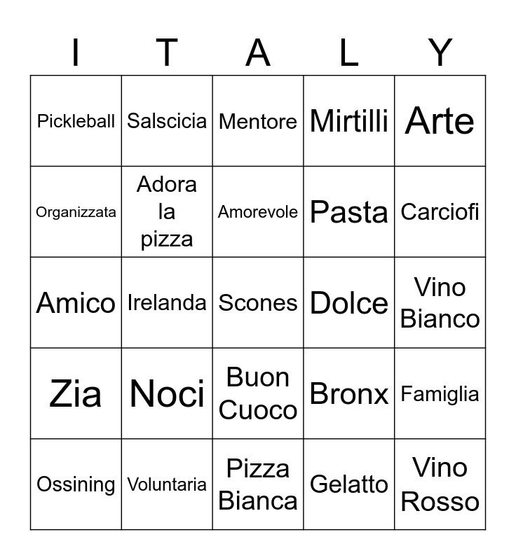 This bingo card has 35 words: Buon Fornnaio, Tre Sorelle, E' Generoso, Adora la pizza, Buon Cuoco, Mirtilli, Organizzata, Ricercatotre, Amorevole, Italia, Amico, Arte, Insegnante, Canasta, Pickleball, Dolce, Gelatto, Irelanda, Zia, Scones, Bronx, Ossining, Famiglia, Voluntaria, Mentore, Carciofi, Vino Rosso, Polpette, Pasta, Vino Bianco, Bibliotecario, Pizza Bianca, Noci, Salscicia and Limoni.