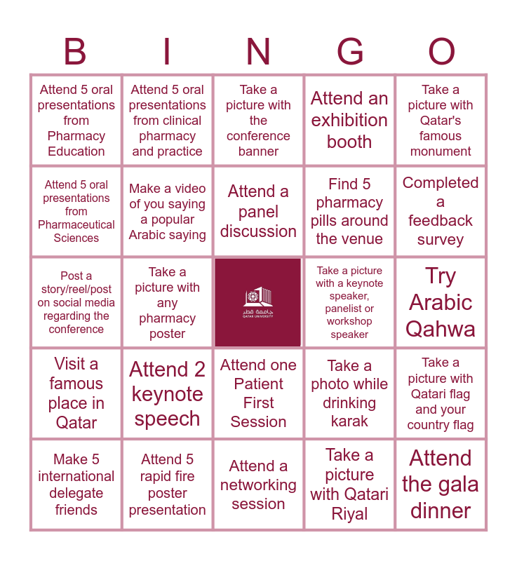 This bingo card has a free space and 24 words: Attend 2 keynote speech, Attend 5 rapid fire poster presentation, Attend a panel discussion, Make 5 international delegate friends, Take a picture with Qatar's famous monument, Attend 5 oral presentations from Pharmacy Education, Attend 5 oral presentations from Pharmaceutical Sciences, Attend 5 oral presentations from clinical pharmacy and practice, Take a picture with a keynote speaker, panelist or workshop speaker, Attend one Patient First Session, Find 5 pharmacy pills around the venue, Post a story/reel/post on social media regarding the conference, Take a photo while drinking karak, Take a picture with Qatari flag and your country flag, Make a video of you saying a popular Arabic saying, Take a picture with Qatari Riyal, Try Arabic Qahwa, Take a picture with the conference banner, Completed a feedback survey, Take a picture with any pharmacy poster, Attend the gala dinner, Visit a famous place in Qatar, Attend an exhibition booth and Attend a networking session.