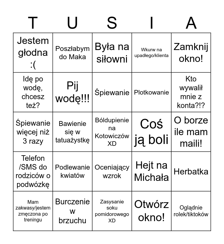 This bingo card has 25 words: Telefon /SMS do rodziców o podwózkę, Burczenie w brzuchu, Bóldupienie na Kotowiczów XD, Otwórz okno!, Zamknij okno!, Jestem głodna :(, Poszłabym do Maka, Była na siłowni, Coś ją boli, Herbatka, Idę po wodę, chcesz też?, Pij wodę!!!, Zasysanie soku pomidorowego XD, Hejt na Michała, Kto wywalił mnie z konta?!?, Mam zakwasy/jestem zmęczona po treningu, Bawienie się w tatuażystkę, Śpiewanie, Plotkowanie, O borze ile mam maili!, Śpiewanie więcej niż 3 razy, Podlewanie kwiatów, Oceniający wzrok, Wkurw na upadłego/klienta and Oglądnie rolek/tiktoków.