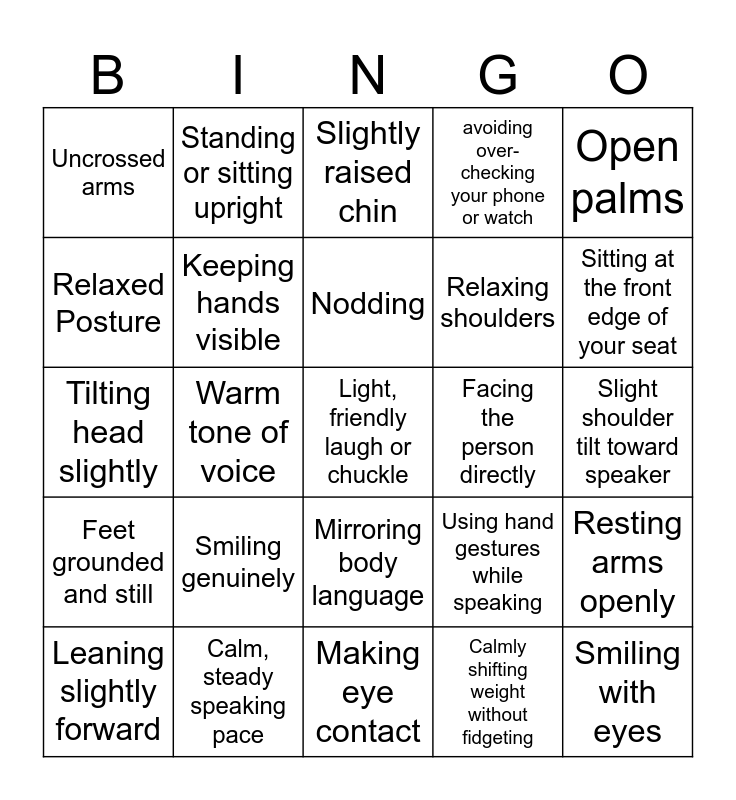 This bingo card has 25 words: Smiling genuinely, Making eye contact, Nodding, Leaning slightly forward, Open palms, Uncrossed arms, Relaxed Posture, Standing or sitting upright, Facing the person directly, Mirroring body language, Relaxing shoulders, Tilting head slightly, Using hand gestures while speaking, Resting arms openly, Keeping hands visible, Smiling with eyes, Slight shoulder tilt toward speaker, Slightly raised chin, Sitting at the front edge of your seat, Warm tone of voice, Light, friendly laugh or chuckle, Calm, steady speaking pace, Feet grounded and still, avoiding over-checking your phone or watch and Calmly shifting weight without fidgeting.