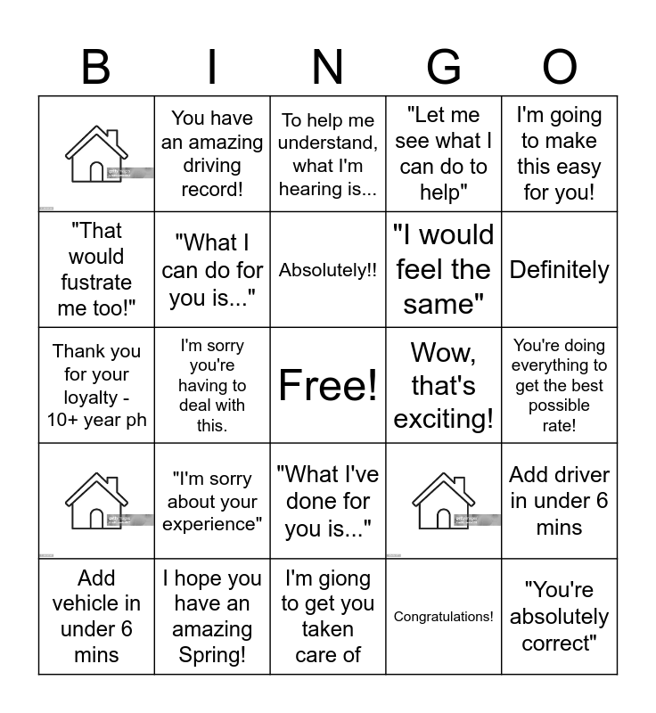 This bingo card has 3 images, a free space and 21 words: "I'm sorry about your experience", I hope you have an amazing Spring!, Absolutely!!, Add vehicle in under 6 mins, I'm going to make this easy for you!, "That would fustrate me too!", You have an amazing driving record!, Wow, that's exciting!, "What I've done for you is...", "I would feel the same", Thank you for your loyalty - 10+ year ph, Add driver in under 6 mins, "What I can do for you is...", Congratulations!, You're doing everything to get the best possible rate!, To help me understand, what I'm hearing is..., Definitely, I'm sorry you're having to deal with this., "You're absolutely correct", "Let me see what I can do to help" and I'm giong to get you taken care of.