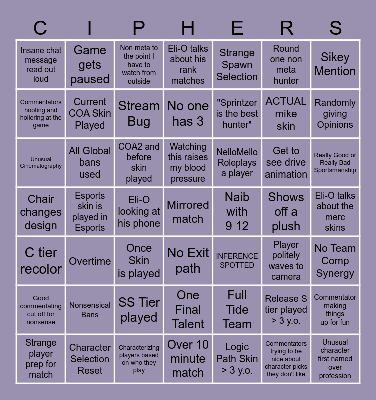 This bingo card has 49 words: Release S tier played > 3 y.o., ACTUAL mike skin, Logic Path Skin > 3 y.o., Esports skin is played in Esports, COA2 and before skin played, Eli-O talks about the merc skins, Game gets paused, Characterizing players based on who they play, Round one non meta hunter, No Exit path, Sikey Mention, Eli-O talks about his rank matches, Get to see drive animation, NelloMello Roleplays a player, Nonsensical Bans, Shows off a plush, Commentators hooting and hollering at the game, Randomly giving Opinions, Commentator making things up for fun, Strange Spawn Selection, "Sprintzer is the best hunter", Eli-O looking at his phone, Insane chat message read out loud, Current COA Skin Played, Strange player prep for match, Stream Bug, Really Good or Really Bad Sportsmanship, Character Selection Reset, Watching this raises my blood pressure, All Global bans used, Unusual character first named over profession, Naib with 9 12, Good commentating cut off for nonsense, SS Tier played, Chair changes design, INFERENCE SPOTTED, Player politely waves to camera, No Team Comp Synergy, Unusual Cinematography, Once Skin is played, One Final Talent, C tier recolor, Mirrored match, Over 10 minute match, No one has 3, Non meta to the point I have to watch from outside, Full Tide Team, Overtime and Commentators trying to be nice about character picks they don't like.