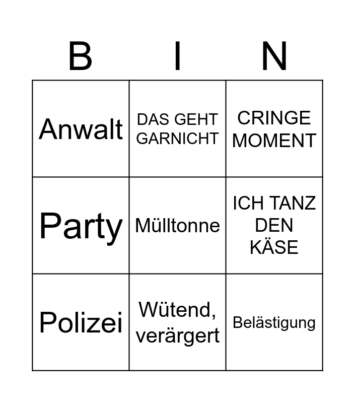 This bingo card has a free space and 8 words: ICH TANZ DEN KÄSE, CRINGE MOMENT, DAS GEHT GARNICHT, Polizei, Anwalt, Belästigung, Party and Wütend, verärgert.