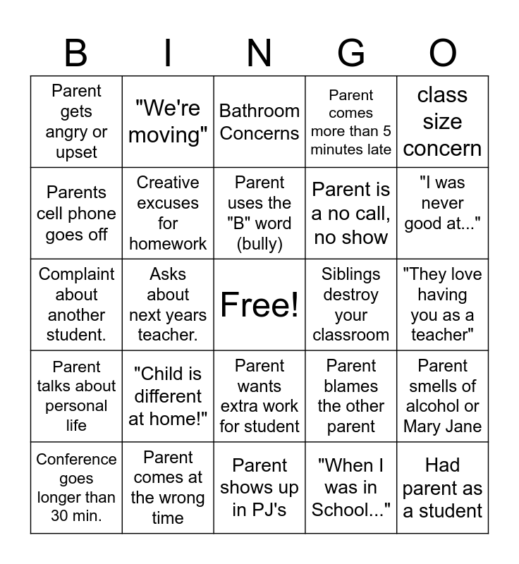 This bingo card has a free space and 24 words: "Child is different at home!", Parent comes at the wrong time, Parent uses the "B" word (bully), Conference goes longer than 30 min., class size concern, Parent gets angry or upset, Parents cell phone goes off, "We're moving", Siblings destroy your classroom, Parent wants extra work for student, Parent is a no call, no show, Complaint about another student., Parent blames the other parent, Parent smells of alcohol or Mary Jane, Creative excuses for homework, "When I was in School...", "They love having you as a teacher", Bathroom Concerns, "I was never good at...", Asks about next years teacher., Had parent as a student, Parent talks about personal life, Parent comes more than 5 minutes late and Parent shows up in PJ's.