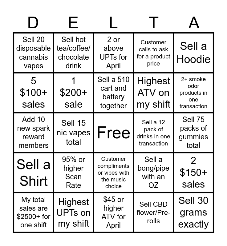 This bingo card has a free space and 24 words: 95% or higher Scan Rate, Highest UPTs on my shift, Sell a 510 cart and battery together, My total sales are $2500+ for one shift, Sell a Hoodie, Sell 20 disposable cannabis vapes, 5 $100+ sales, Sell hot tea/coffee/ chocolate drink, Sell a 12 pack of drinks in one transaction, Customer compliments or vibes with the music choice, Highest ATV on my shift, Add 10 new spark reward members, Sell a bong/pipe with an OZ, 2 $150+ sales, 1 $200+ sale, Sell CBD flower/Pre-rolls, Sell 75 packs of gummies total, 2 or above UPTs for April, 2+ smoke odor products in one transaction, Sell 15 nic vapes total, Sell 30 grams exactly, Sell a Shirt, Customer calls to ask for a product price and $45 or higher ATV for April.