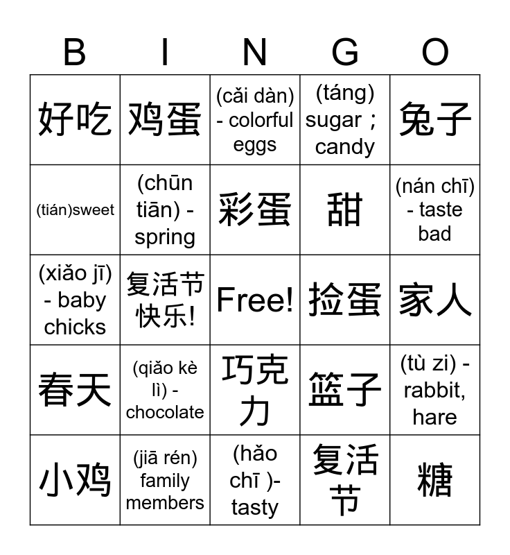 This bingo card has a free space and 32 words: 复活节, (fù huó jié) - Easter, 复活节快乐!, (fù huó jié kuài lè) - Happy Easter!, 春天, (chūn tiān) - spring, 兔子, (tù zi) - rabbit, hare, 鸡蛋, (jī dàn) egg, 彩蛋, (cǎi dàn) - colorful eggs, 找蛋, (zhǎo dàn) - egg hunt, 捡蛋, (jiǎn dàn)egg hunt, 小鸡, (xiǎo jī) - baby chicks, 巧克力, (qiǎo kè lì) - chocolate, 篮子, (lán zi) - basket, 家人, (jiā rén) family members, 糖, (táng) sugar;candy, 甜, (tián)sweet, 好吃, (hǎo chī )- tasty, 难吃 and (nán chī) - taste bad.