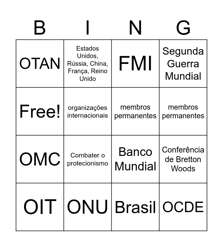 This bingo card has 16 words: ONU, Conferência de Bretton Woods, FMI, OTAN, OMC, Estados Unidos, Rússia, China, França, Reino Unido, Banco Mundial, Brasil, Free!, organizações internacionais, OIT, Segunda Guerra Mundial, Combater o protecionismo, membros permanentes, membros permanentes and OCDE.