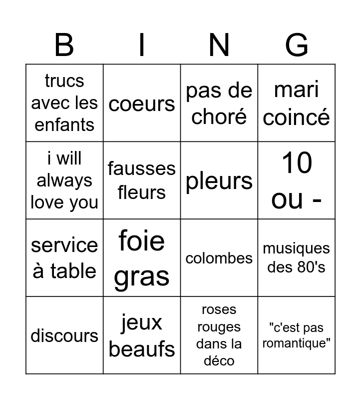 This bingo card has 16 words: jeux beaufs, musiques des 80's, pas de choré, trucs avec les enfants, service à table, coeurs, colombes, roses rouges dans la déco, i will always love you, fausses fleurs, discours, mari coincé, foie gras, 10 ou -, pleurs and "c'est pas romantique".
