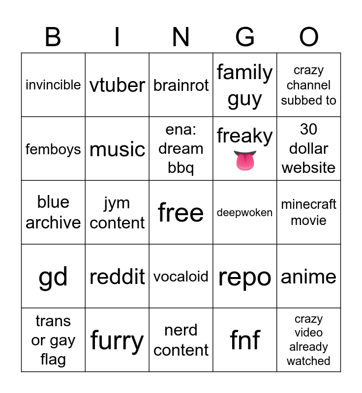 This bingo card has a free space and 24 words: reddit, furry, ena: dream bbq, trans or gay flag, crazy channel subbed to, invincible, femboys, vtuber, deepwoken, vocaloid, freaky 👅, blue archive, repo, anime, music, fnf, minecraft movie, brainrot, 30 dollar website, jym content, crazy video already watched, gd, family guy and nerd content.