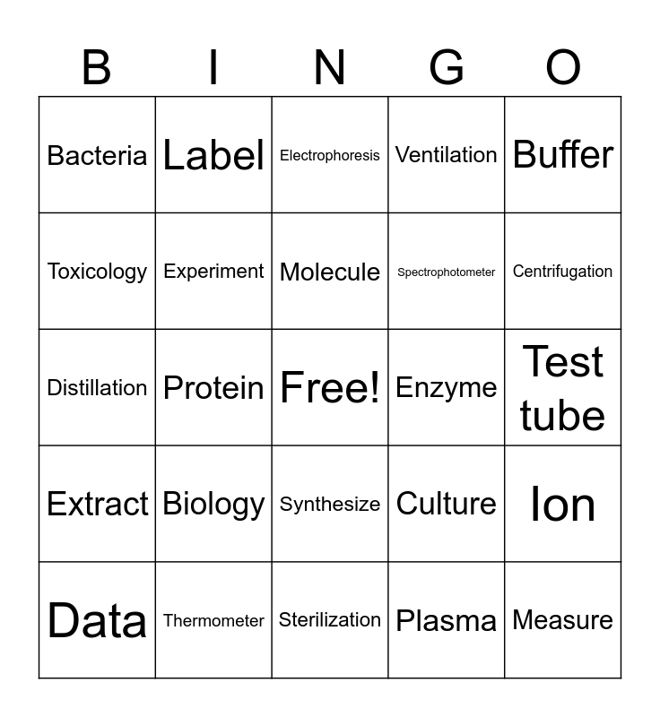 This bingo card has a free space and 100 words: Beaker, Flask, Test tube, Bunsen burner, Pipette, Microscope, Centrifuge, Petri dish, Graduated cylinder, Tongs, Funnel, Mortar, Pestle, Thermometer, Stopwatch, Stirring rod, Spectrophotometer, Incubator, Balance, Autoclave, Solvent, Solute, Reagent, Catalyst, Compound, Enzyme, Buffer, Culture, DNA, RNA, Protein, Bacteria, Virus, Cell, Plasma, Molecule, Ion, pH, Isotope, Polymer, Titration, Filtration, Distillation, Chromatography, Centrifugation, Electrophoresis, PCR (Polymerase Chain Reaction), Incubation, Staining, Sterilization, PPE (Personal Protective Equipment), Gloves, Goggles, Lab coat, Fume hood, Eyewash station, Spill kit, MSDS (Material Safety Data Sheet), Contamination, Ventilation, Milliliter, Gram, Celsius, Mole, Micrometer, Nanometer, Liter, Watt, Hertz, Ampere, Chemistry, Biology, Physics, Microbiology, Biochemistry, Genetics, Pathology, Toxicology, Hematology, Forensics, Observe, Measure, Analyze, Synthesize, Record, Label, Mix, Transfer, Calibrate, Extract, Sample, Control, Variable, Data, Experiment, Hypothesis, Trial, Conclusion, Notebook and Protocol.