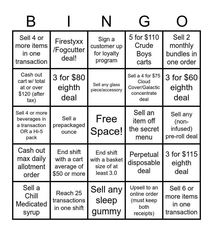 This bingo card has a free space and 24 words: End shift with a cart average of $50 or more, Reach 25 transactions in one shift, Sell any glass piece/accessory, Sell a Chill Medicated syrup, Sell 2 monthly bundles in one order, Sell 4 or more items in one transaction, Cash out cart w/ total at or over $120 (after tax), Firestyxx /Fogcutter deal!, Sell an item off the secret menu, End shift with a basket size of at least 3.0, Sell a 4 for $75 Cloud Cover/Galactic concentrate deal, Sell 4 or more beverages in a transaction OR a Hi-5 pack, Perpetual disposable deal, 3 for $115 eighth deal, 3 for $80 eighth deal, Upsell to an online order (must keep both receipts), Sell any (non-infused) pre-roll deal, Sign a customer up for loyalty program, 3 for $60 eighth deal, Sell a prepackaged ounce, Sell 6 or more items in one transaction, Cash out max daily allotment order, 5 for $110 Crude Boys carts and Sell any sleep gummy.