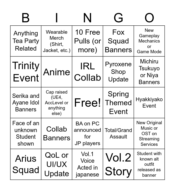 This bingo card has a free space and 24 words: Collab Banners, QoL or UI/UX Update, IRL Collab, Arius Squad, New Gameplay Mechanics or Game Mode, Anything Tea Party Related, Trinity Event, Wearable Merch (Shirt, Jacket, etc.), Spring Themed Event, BA on PC announced for JP players, Pyroxene Shop Update, Serika and Ayane Idol Banners, Total/Grand Assault, New Original Music or OST on Streaming Services, Anime, Vol.2 Story, Hyakkiyako Event, 10 Free Pulls (or more), Michiru Tsukuyo or Niya Banners, Cap raised (UE4, AccLevel or anything else), Student with known alt outfit released as banner, Face of an unknown Student shown, Fox Squad Banners and Vol.1 Voice Acted in japanese.